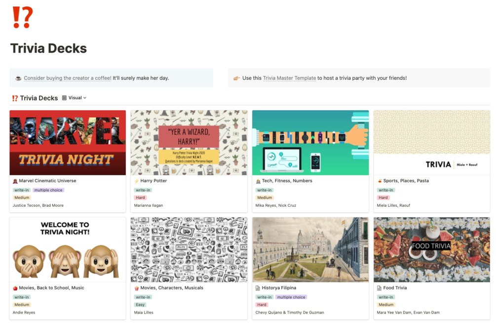 - 9 trivia decks of different topics (Marvel, Harry Potter, Tech, Fitness, Math, Food, Philippine Trivia, Chick Flicks+)